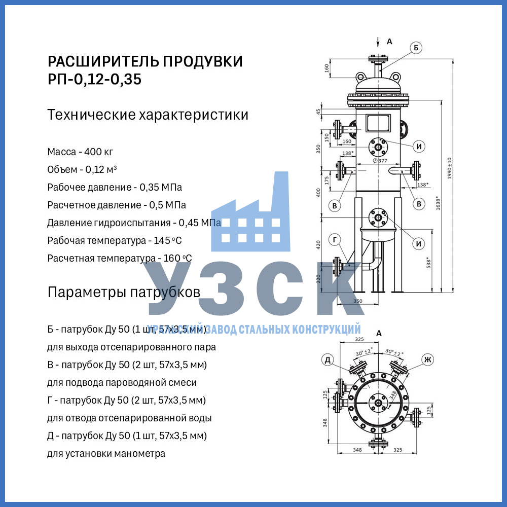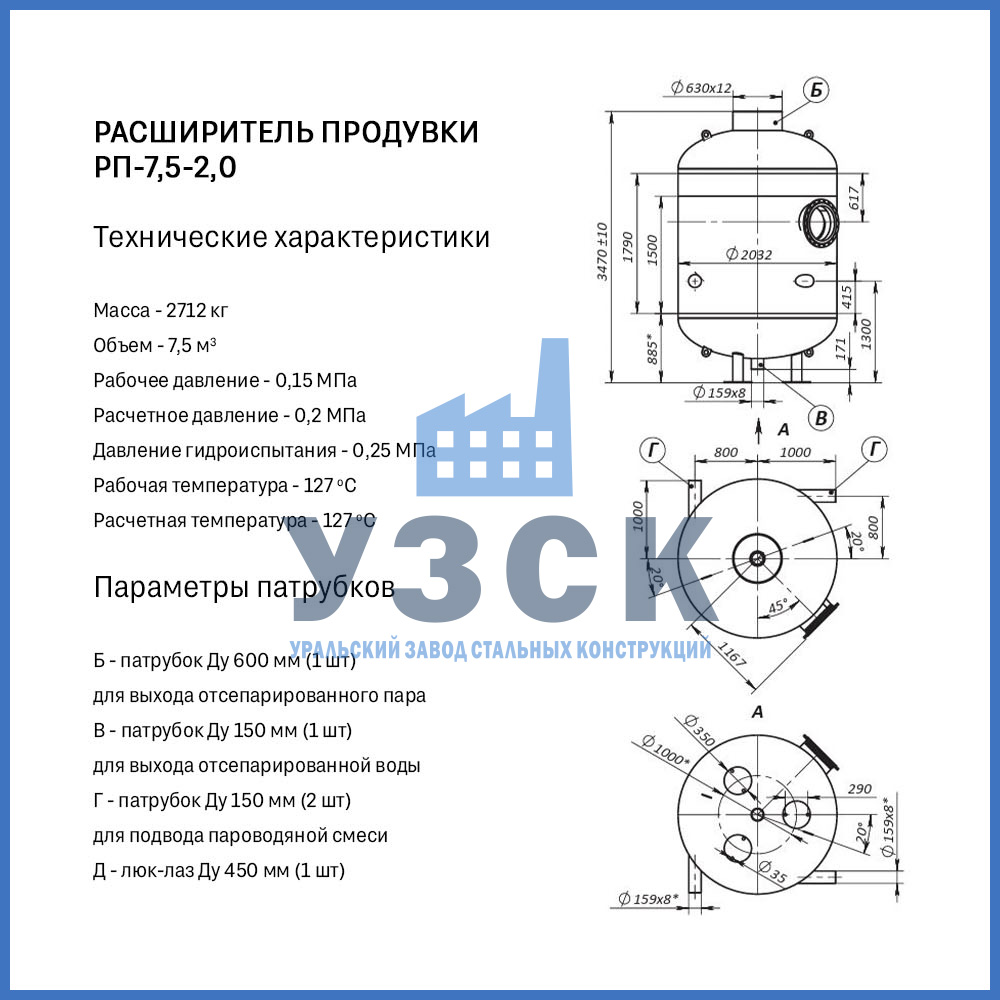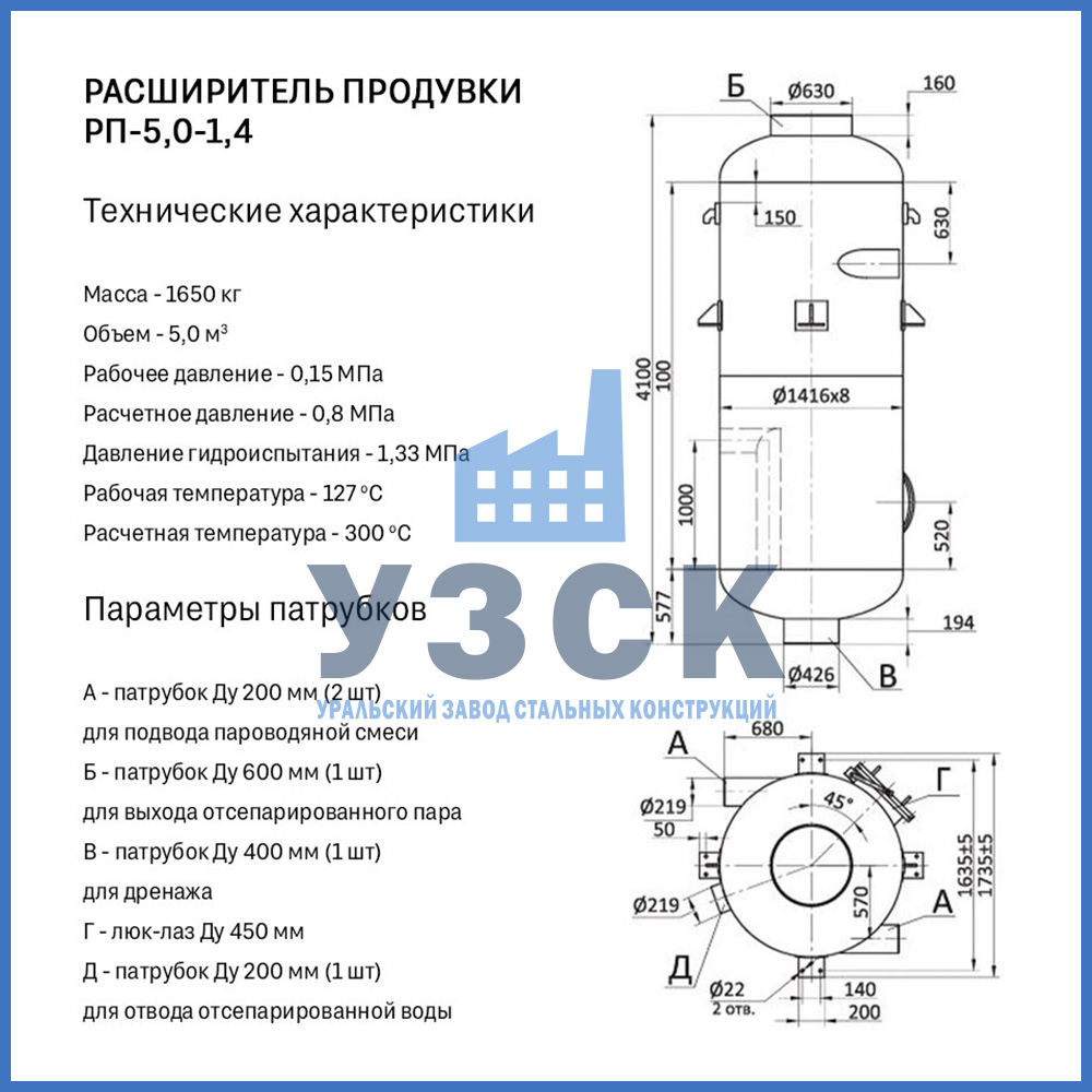 Конструктивно расширитель продувки (РП) — это вертикальный цилиндрический сосуд, изготавливаемый из стальной обечайки с эллиптическими днищами. Стандартная комплектация включает: